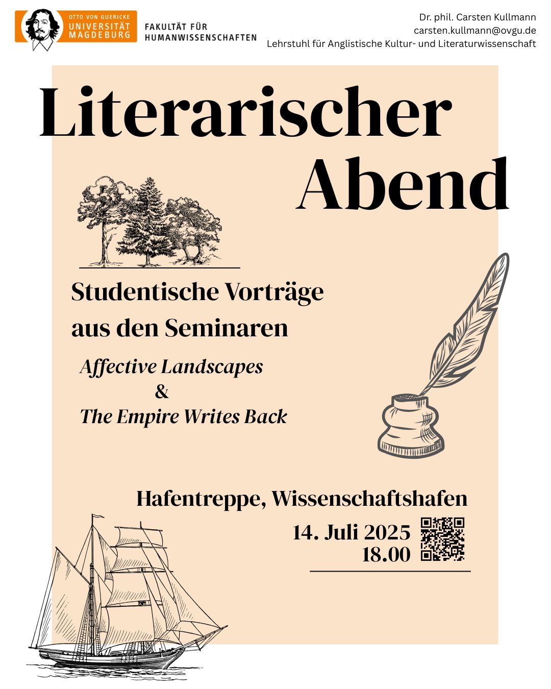 Ein literarischer Abend im Wissenschaftshafen dient der Präsentation studentischer Arbeitsergebnisse zweier Seminare, die im Sommersemester 2025 vom Lehrstuhl für Anglistische Kultur- und Literaturwissenschaft gehalten wurden. Studierende im Seminar „The Empire Writes Back“ befassten sich mit der Beziehung zwischen kanonischen englischen Romanen und deren Neuschreibung durch Autor:innen aus ehemaligen britischen Kolonien. Im Zentrum des Erkenntnisinteresses steht die Frage nach den Techniken und den Zielen dieser Praktik des „writing backs“ sowie der Funktion von Literatur in der Aufarbeitung europäischer Kolonialgeschichte. Studierende des Seminars „Affective Landscapes“ haben sich im Laufe des Semesters der Frage nach der kulturellen Überformung materieller Räume gewidmet und erforscht, wie unterschiedliche Räume aufgrund ihrer Gemachtheit kulturell erfahren werden. Im Zuge von sechs Exkursionen wurden Stadt- und Naturräume erkundet und die Art und Weise, wie wir Räume wahrnehmen, gestalten und beanspruchen diskutiert.