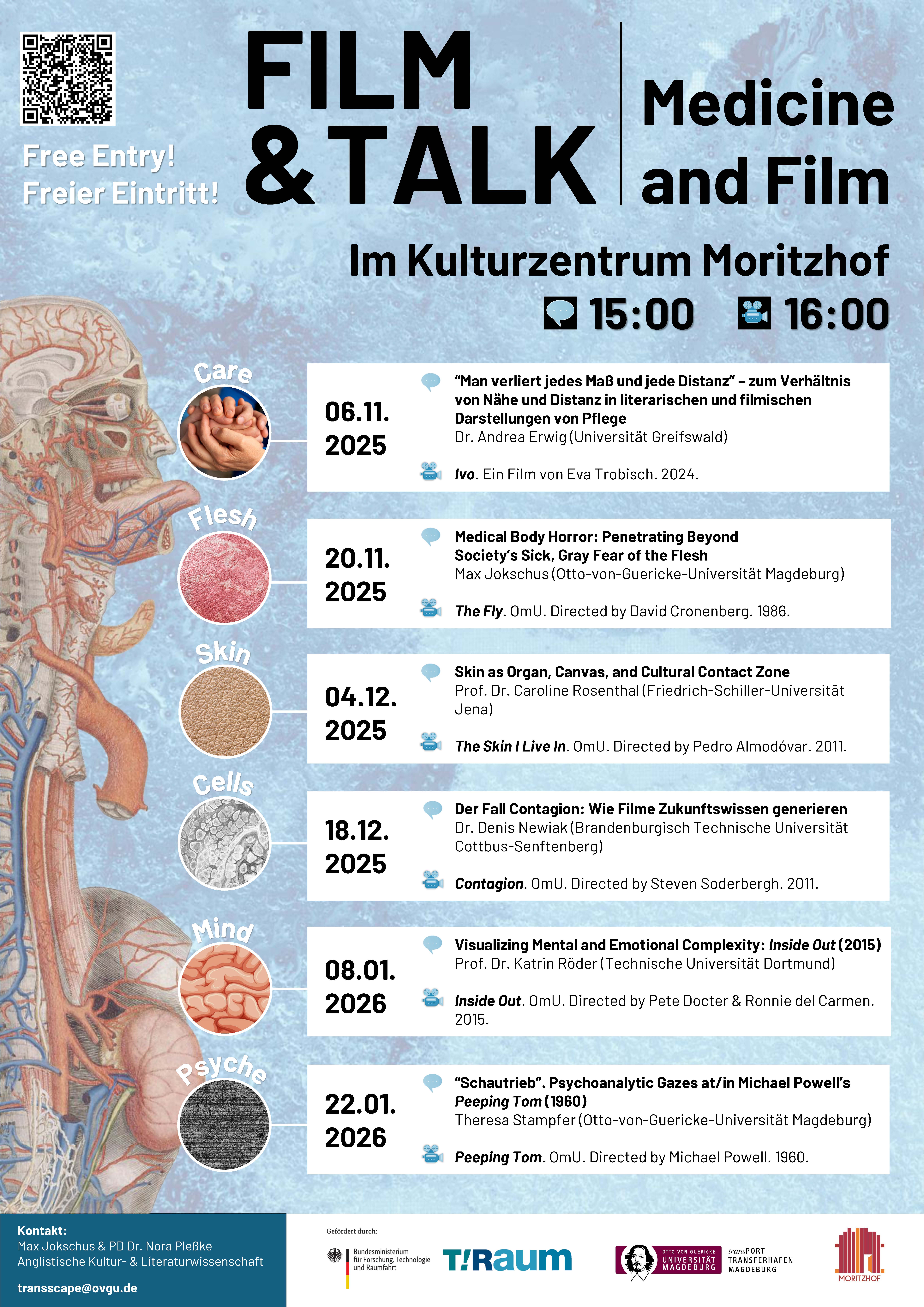 "Medicine and Film" continues the discussion on productive interdisciplinary collaboration between medicine and the humanities that began in the 2025 summer semester in the lecture series "Medical Humanities: The Treatment of Illness in the Humanities". In the winter semester 2025/26, the focus will be on the representation of medicine and medical topics in film. Primarily, various dimensions on screen such as science and ethics, medical representations of healing practices and diseases, power relations between doctors, nurses and patients, and cultural notions of healthy/sick bodies will be foregrounded. From the perspective of cultural studies and medical humanities, the topic will therefore be examined through the relations of the body – from care, flesh, skin, cells and mind to the deep psyche. The FILM & TALK format frames the film screening with a guest lecture by an academic and an open discussion led by FHW students.