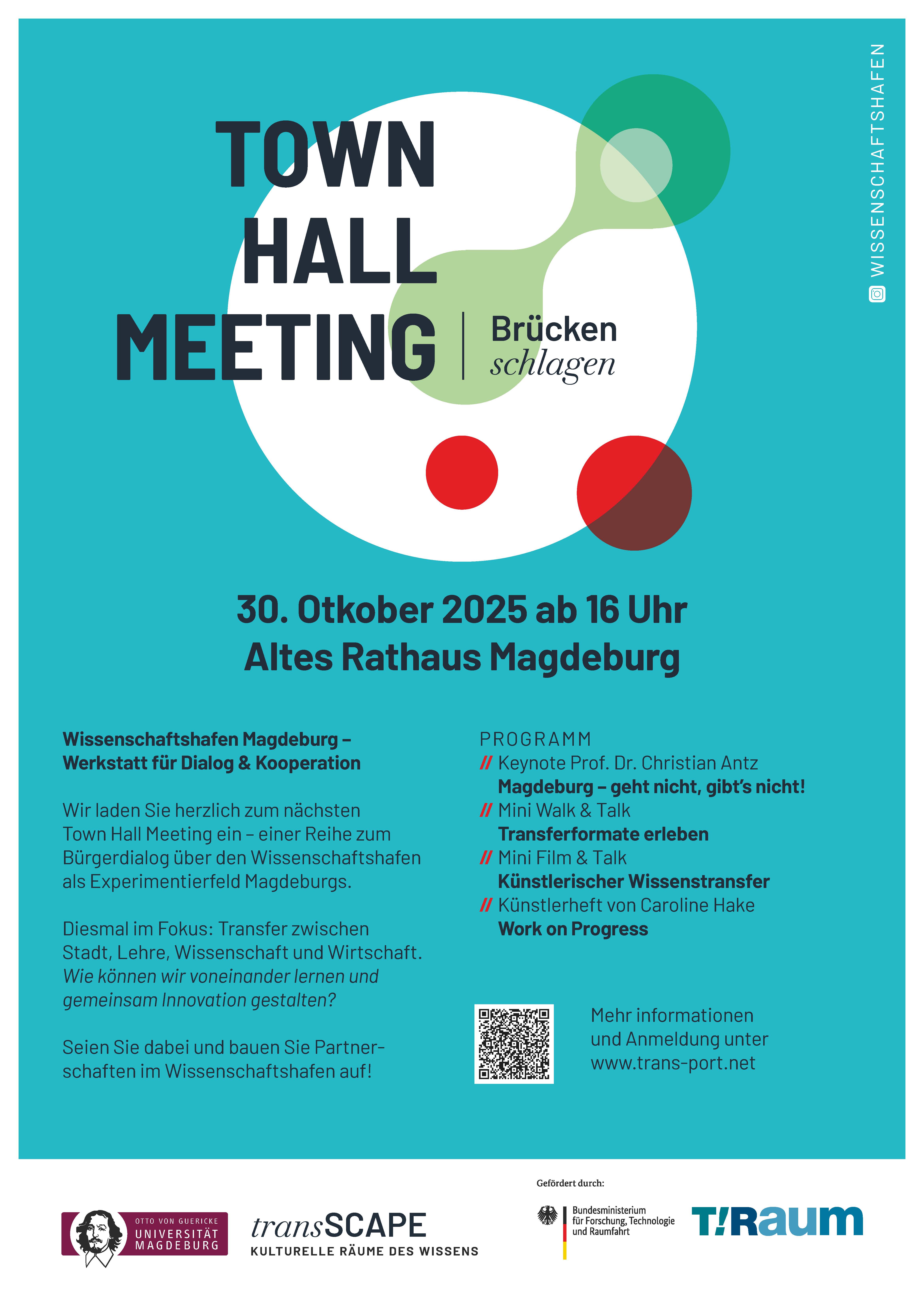 On Thursday, 30 October 2025, the transSCAPE team cordially invites you to the fifth Town Hall Meeting. This open format brings together stakeholders from the the academic, urban, and cultural communities to actively shape the future of Magdeburg's Port of Science. The focus is on transfer formats and the question of how knowledge transfer and cooperation between the city, society, science and business can be successful. Registration is requested.
